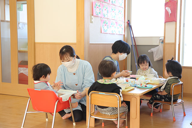 | クラス | 0,1歳児 すみれ組 2歳児 もみじ組 3歳児 たんぽぽ組 4歳児 うめ組 5歳児 まつ組 |